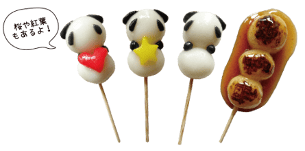 Skewered rice dumplings covered in a sweet sauce, in the shape of a panda!